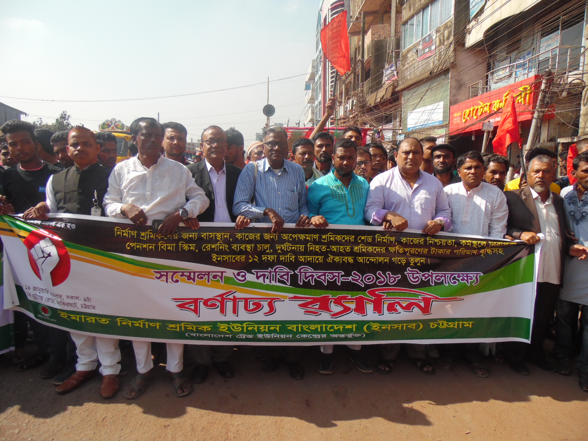 মোঃ আসাদুল ইসলাম,চট্রগ্রাম প্রতিনিধি।। আজ সকাল ৯টায় চট্রগ্রাম মাঝির ঘাট এলাকায় ১২ দফা দাবি আদায়ে সম্মেলন ও র‌্যালী বের করেন ইমারত নির্মান শ্রমিক ইউনিয়ন বাংলাদেশ (ইনসাব),চট্রগ্রাম মহানগর । র‌্যালীটি মাঝির ঘাট থেকে সদর ঘাট ,কালিবাড়ী মোর ও কদমতলী হয়ে মাঝিরঘাট এসে শেষ হয়। সভাপতি মহানগর কমিটি ইনসাব, মোঃ জসিম উদ্দিনের সভাপতিত্বে পতাকা উত্তলনের মধ্যাদিয়ে অনুষ্ঠান শুরু হয়।