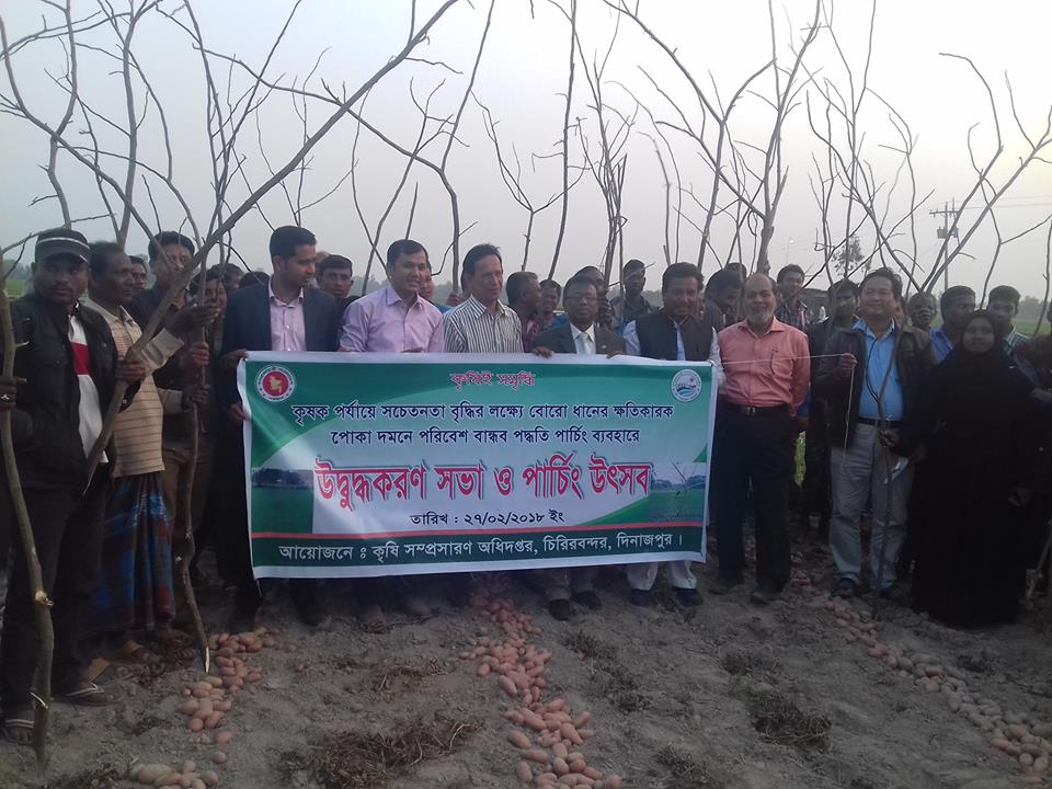 এ সময় দিনাজপুর কৃষি স¤প্রসারণ অধিদপ্তরের উপ-পরিচালক কৃষিবিদ মোঃ তৌহিদুল ইকবাল এ উৎসবের আনুষ্ঠানিক উদ্বোধন করেন। অনুষ্ঠানে উপজেলা কৃষি অফিসার মো: মাহমুদুল হাসানের সভাপতিত্বে বক্তব্য রাখেন কৃষি বিশেষজ্ঞ (আইএফডিসি) ডা: শাহারুখ আহম্মেদ,কৃষি স¤প্রসারণ কর্মকর্তা মোঃ শরিফুল ইসলাম, মৃত্তিকা বিজ্ঞানী মো: মাইনুল আহাসান,সার উন্নয়ন কেন্দ্রের (আইএফডিসি) ফিল্ড কো-অর্ডিনেটর আবু জাফর মুহম্মদ নূর নবী,উপ-সহকারী কৃষি কর্মকর্তা ফণি ভুষণ রায় প্রমূখ। অনুষ্ঠানে বক্তারা বলেন, পার্চিং হচ্ছে ফসলি জমিতে লম্বা খুঁটি বা বাঁশ পুঁতে রাখা, যাতে এসব খুঁটিতে সহজে পাখি বসতে পারে। এতে ফসলের ক্ষতিকর পোকা খেতে পাখির সুবিধা হয়, সঙ্গে জৈবিকভাবে পোকা দমন হয়। ফলে বালাইনাশক ব্যবহার করতে হয় না। পরিবেশের ভারসাম্য নষ্ট হয় না। এভাবে জমিতে স্থাপন করা খুঁটি বা ধৈ ার গাছ লাগিয়ে পাখির বসার ব্যবস্থা করে দেওয়াই হচ্ছে পার্চিং। পার্চিং পদ্ধতিতে ধানের জমিতে পোকা দমন এরই মধ্যে চিরিরবন্দর উপজেলায় বেশ জনপ্রিয় হয়ে উঠেছে।