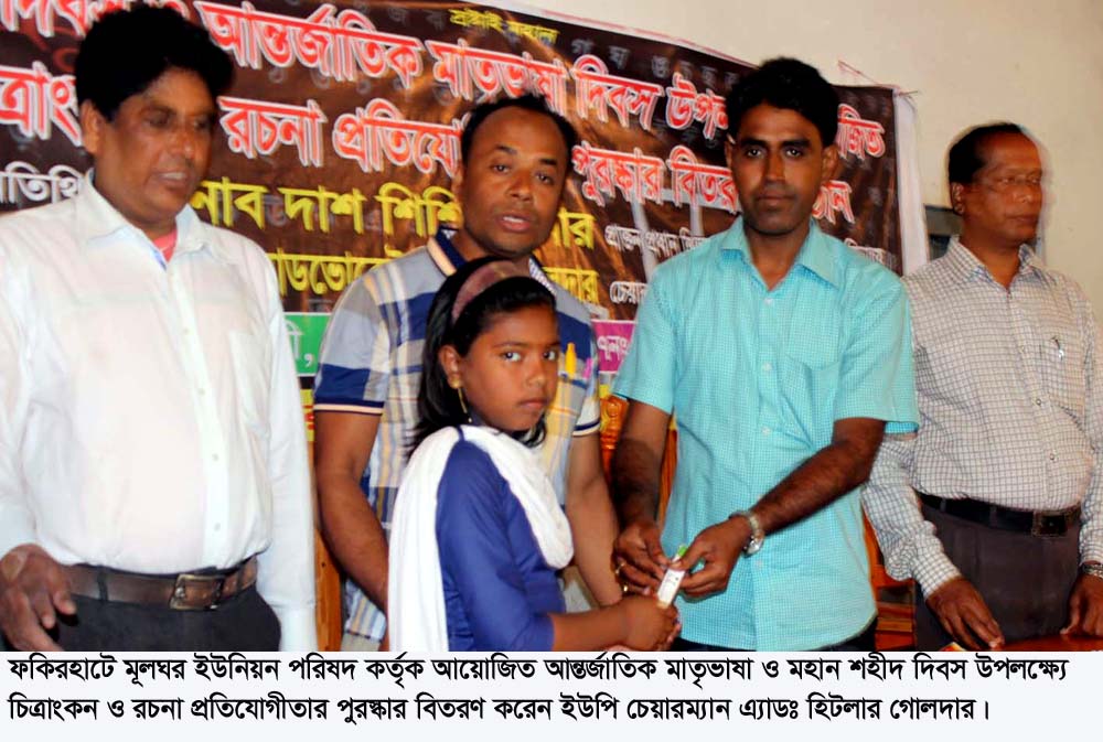 এম এম সি মেহেদী হাসান ঃ বাগেরহাটের ফকিরহাট উপজেলার মূলঘর ইউনিয়ন পরিষদ কর্তৃক আয়োজিত আন্তর্জাতিক মাতৃভাষা ও মহান শহীদ দিবস উপলক্ষ্যে ২২ ফেব্রæয়ারি দুপুর ১২টায় পরিষদ মিলনায়তনে বিভিন্ন শিক্ষা প্রতিষ্ঠানের শিক্ষার্থীদের চিত্রাংকন ও রচনা প্রতিযোগীতার পুরস্কার বিতরণ অনুষ্ঠিত হয়। অনুষ্ঠানে সভাপতিত্ব করেন উপজেলা আ,লীগের আইন বিষয়ক সম্পাদক ও ইউপি চেয়ারম্যান এ্যাডঃ হিটলার গোলদার। এসময় শিক্ষাবীদ দাশ শিশির কুমার, শিক্ষক দুলাল গোলদার ইউপি সচিব মোসাঃ ফাতেমা তুজ জোহরা, ইউপি সদস্যা সাধনা রানী মন্ডল, আল্লাদী বিশ^াস, সমাজ সেবক তাছলিম হোসেন, , নবলোক প্রতিনিধি আঃ হান্নান, সহ বিভিন্ন শিক্ষা প্রতিষ্ঠানের শিক্ষক ও শিক্ষার্থী উপস্থিত ছিলেন।