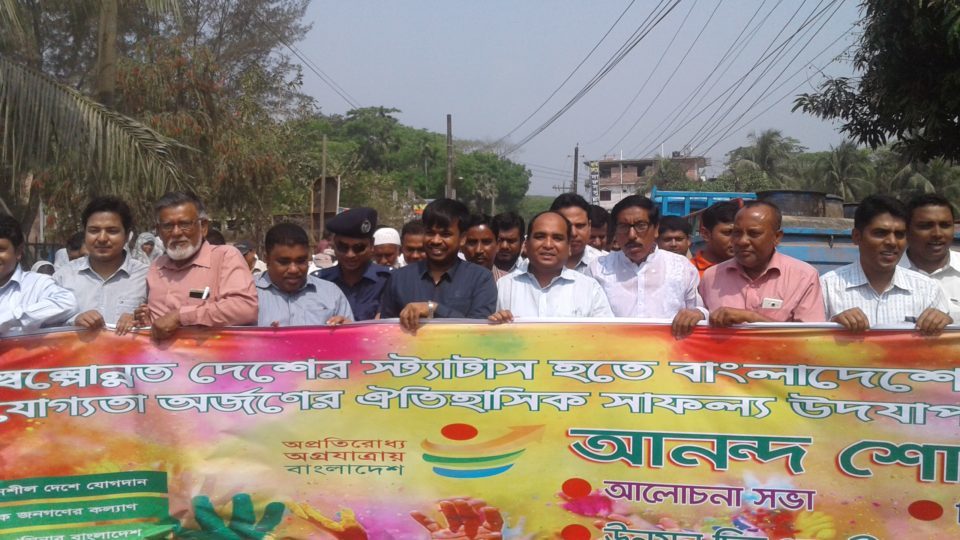 বোরহানউদ্দিন প্রতিনিধি: ভোলার বোরহানউদ্দিন উপজেলা প্রশাসনের আয়োজনে বাংলাদেশ স্বল্পোন্নত দেশ থেকে উন্নয়নশীল দেশের যোগ্যতা অর্জনের ঐতিহাসিক সাফল্য উদযাপন উপলক্ষে বর্ণাঢ্য শোভাযাত্রা, র্যালি ও বিভিন্ন কর্মসুচীর মাধ্যমে পালন করে বোরহানউদ্দিনের সকল শ্রেনী পেশার মানুষ। বৃহস্পতিবার সকাল ১০টাকা বোরহানউদ্দিন ডাকবাংলোর সামনে থেকে র্যালি বের হয়ে বোরহনউদ্দিন পৌর শহরের প্রধান প্রধান সড়ক প্রদিক্ষন করে মুক্তিযোদ্ধ কমপ্লেক্স ভবনে এক আলোচনা সভা অনুষ্ঠিত হয়। বোরহানউদ্দিন পৌর মেয়র ও উপজেলা নির্বহী কর্মকর্তা আ: কুদ্দুসের সভাপতিত্বে উক্ত আলোচনা সভায় বক্তব্য প্রধান করেন বোরহানউদ্দিন পৌর মেয়র ও উপজেলা আ’লীগের সাধারন সম্পাদক আলহাজ্ব রফিকুল ইসলাম, উপজেলা ভাইস চেয়ারম্যান মো: রাসেল আহমেদ মিয়া, উপজেলা মুক্তযোদ্ধা কমান্ডার ইঞ্জিনিয়ার আহম্মদ উল্ল্যাহ, বোরহানউদ্দিন থানা অভিসার ইনচার্জ অসীম কুমার সিকদার, বোরহানউদ্দিন মাধ্যমিক শিক্ষক সমিতির সাধারন সম্পাদক বশির উল্লাহ সহ প্রশাসনের বিভিন্ন কর্মকর্তা। আলোচনা সভায় বক্তারা বর্তমান সরকারের বিভিন্ন উন্নয়নমূলক কর্মকান্ড ও বর্তমান প্রধানমন্ত্রীর নেতৃত্বের প্রশংসা করে বলেন এর সুফল দেশের প্রতিটা জনগন ভোগ করবে এবং সকলকে এ সাফল্যের ধারাবাহিকতার নিজ নিজ কর্মস্থল থেকে অবদান রাখার আহব্বান জানান।