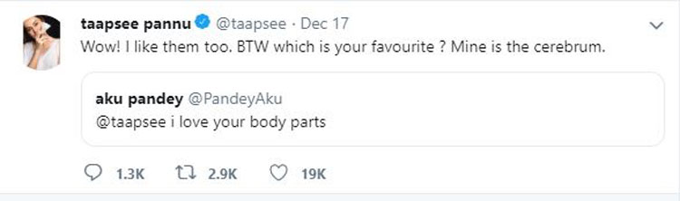 তাপসী তার টুইটে জানিয়েছেন, তিনিও তার দেহের একটা বিশেষ অঙ্গকে ভালবাসেন। আর সেটা হলো ‘সেরিব্রাম’। মস্তিষ্কের এক বিশেষ অংশকে এইভাবে উল্লেখ করে তাপসী তার মস্তিষ্কের ক্ষমতাই প্রমাণ করলেন। সেই সঙ্গে কু-ইঙ্গিতপ্রবণ পুরুষদেরও এক হাত নিলেন ‘পিংক’ (২০১৬)-এর নজরকাড়া অভিনেত্রী।