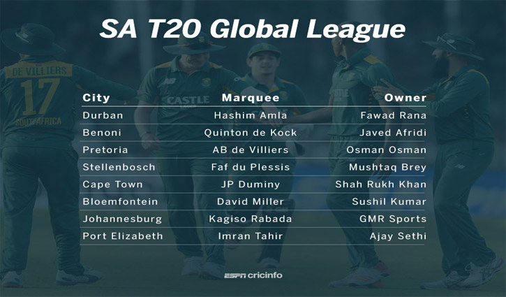 আইপিএলে কলকাতা নাইট রাইডার্স ও সিপিএলে ত্রিনবাগো নাইট রাইডার্স-এর মালিক শাহরুখ কেপ টাউন ফ্র্যাঞ্চাইজির মালিকানা কিনেছেন। তার দলের নাম হবে কেপ টাউন নাইট রাইডার্স। অন্যদিকে দিল্লি ডেয়ারডেভিলসের জিএমআর স্পোর্টস কিনে নিয়েছে জোহানেসবার্গ ফ্র্যাঞ্চাইজির মালিকানা।