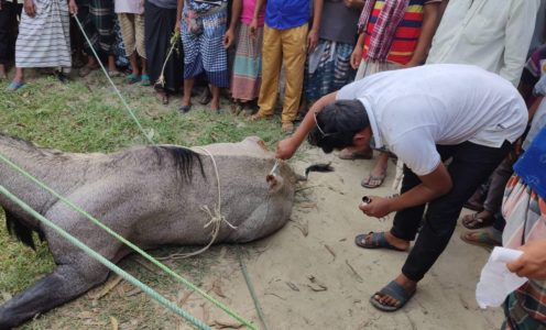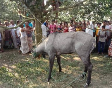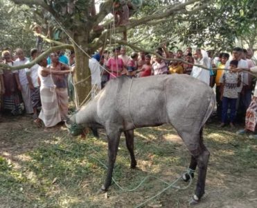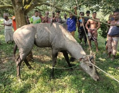 স্থানীয় বাসিন্দা, জনপ্রতিনিধি ও উপজেলা নির্বাহী কর্মকর্তা সূত্রে জানা যায়, দুপুর ১ টার দিকে হঠাৎ স্থানীয়রা দেখতে পায় গলায় দড়ি পেচানো অবস্থায় নীলগাইটি বাগানে ছুটে বেড়াচ্ছে। এসময় ১৫–২০ জন মিলে নীলগাইটিকে ধরে গাছে বেঁধে রেখে স্থানীয় জনপ্রতিনিধিদের খবর দেয়।
