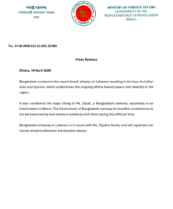 ‘বৈরুতে ইসরাইলি হামলায় দিপালী বেগমের মর্মান্তিক মৃত্যুরও নিন্দা জানায় বাংলাদেশ। বাংলাদেশ সরকার তার পরিবারের প্রতি আন্তরিক সমবেদনা জানাচ্ছে। একই সঙ্গে শোকাহত পরিবারের এই কঠিন সময়ে তাদের সঙ্গে একাত্মতা প্রকাশ করছে।’