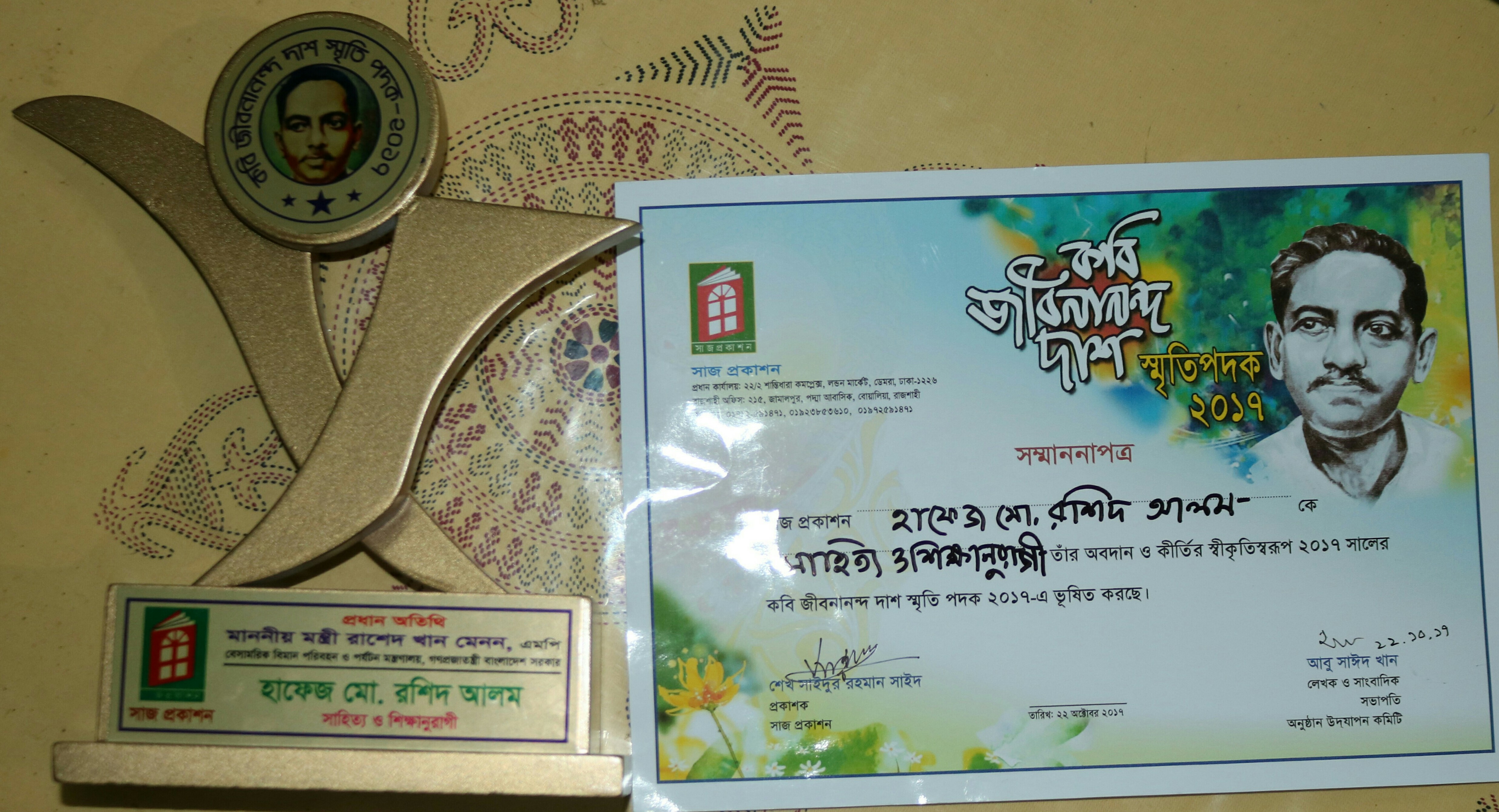 ২২ অক্টোবর (রবিবার) ঢাকাস্থ জাতীয় প্রেসক্লাব ভিআইপি কনফারেন্স লাউঞ্জে কবি জীবনানন্দ দাশের ৬৩ তম মৃত্যুদিবস উপলক্ষে আয়োজিত আলোচনা সভায় হাফেজ মো. রশিদ আলমকে শিক্ষা-সাহিত্যে বিশেষ অবদানের স্বীকৃতিস্বরূপ কবি জীবনানন্দ দাশ স্মৃতিপদক-২০১৭ তুলে দেওয়া হয়।