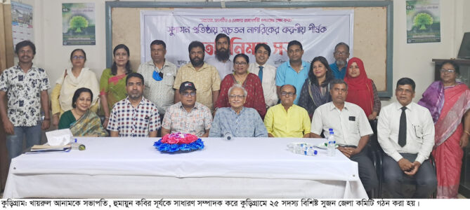 কুড়িগ্রাম প্রতিনিধি: কুড়িগ্রামে সুশাসনের জন্য নাগরিক সুজন জেলা কমিটির নাম ঘোষণা করা হয়েছে। মঙ্গলবার সন্ধ্যায় কুড়িগ্রাম কলেজ মোড়স্থ প্রবীণ ভবণে সুজন কেন্দ্রীয় কমিটির সাধারণ সম্পাদক বদিউল আলম মজুমদারের উপস্থিতিতে ২৫ সদস্য বিশিষ্ট কমিটির নাম ঘোষনা করা হয়। এতে পুণরায় সভাপতি নির্বাচিত হন প্রবীণ শিক্ষক খন্দকার খায়রুল আনাম, সাধারণ সম্পাদক নির্বাচিত হন দৈনিক সংবাদ ও নিউজ টোয়েন্টিফোর টেলিভিশনের কুড়িগ্রাম জেলা প্রতিনিধি বিশিষ্ট সাংবাদিক হুমায়ুন কবির সূর্য।