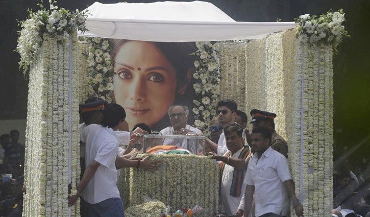 এর আগে এ অভিনেত্রীকে রাষ্ট্রীয় মর্যাদা দেয়া হয়। এছাড়া শেষবারের মতো এ অভিনেত্রীর প্রতি শ্রদ্ধা জানান বলিউডে তার সহকর্মী ও ভক্তবৃন্দ। পূর্ব ঘোষণা অনুযায়ী আজ সকাল সাড়ে নয়টা থেকে পশ্চিম আন্ধেরির লোখান্ডওয়ালা কমপ্লেক্সের সেলিব্রেশন স্পোর্টস ক্লাবে শ্রীদেবীর মরদেহ রাখা হয়।