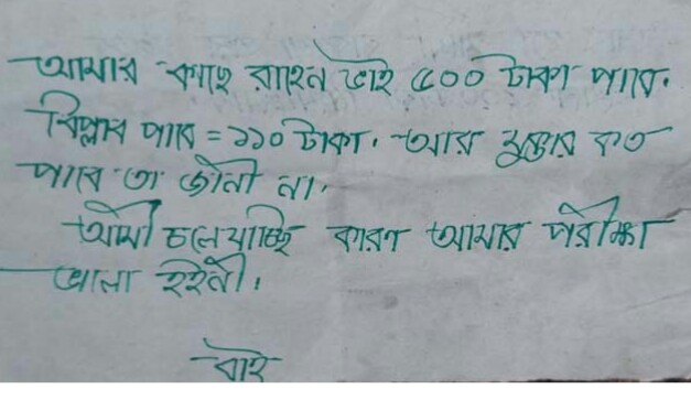 নিহতের মামা জাহিদ হাসান বলেন, সোমবার (২৫ শে ফেব্রুয়ারী) হিসাব বিজ্ঞান পরীক্ষা দিয়ে বাড়ি ফেরে ইয়াছিন। পরে গভীর রাতে সে গলায় রশি দিয়ে আত্মহত্যা করে। আত্মহত্যার আগে পড়ার টেবিলে সে ‘আমি চলে যাচ্ছি কারণ আমার পরীক্ষা ভাল হয়নি, বাই’। তার কাছে কে কত টাকা পাবে তার একটি তালিকা লেখা ‘সুইসাইড নোট’ লিখে রেখে গেছে।