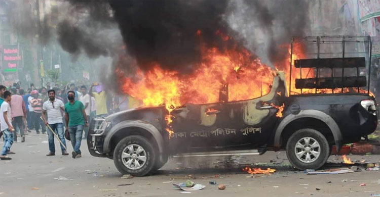 সংঘর্ষ চলাকালে পুলিশের পিকআপ ভ্যানে আগুন ধরিয়ে দেয় বিক্ষুব্ধরা