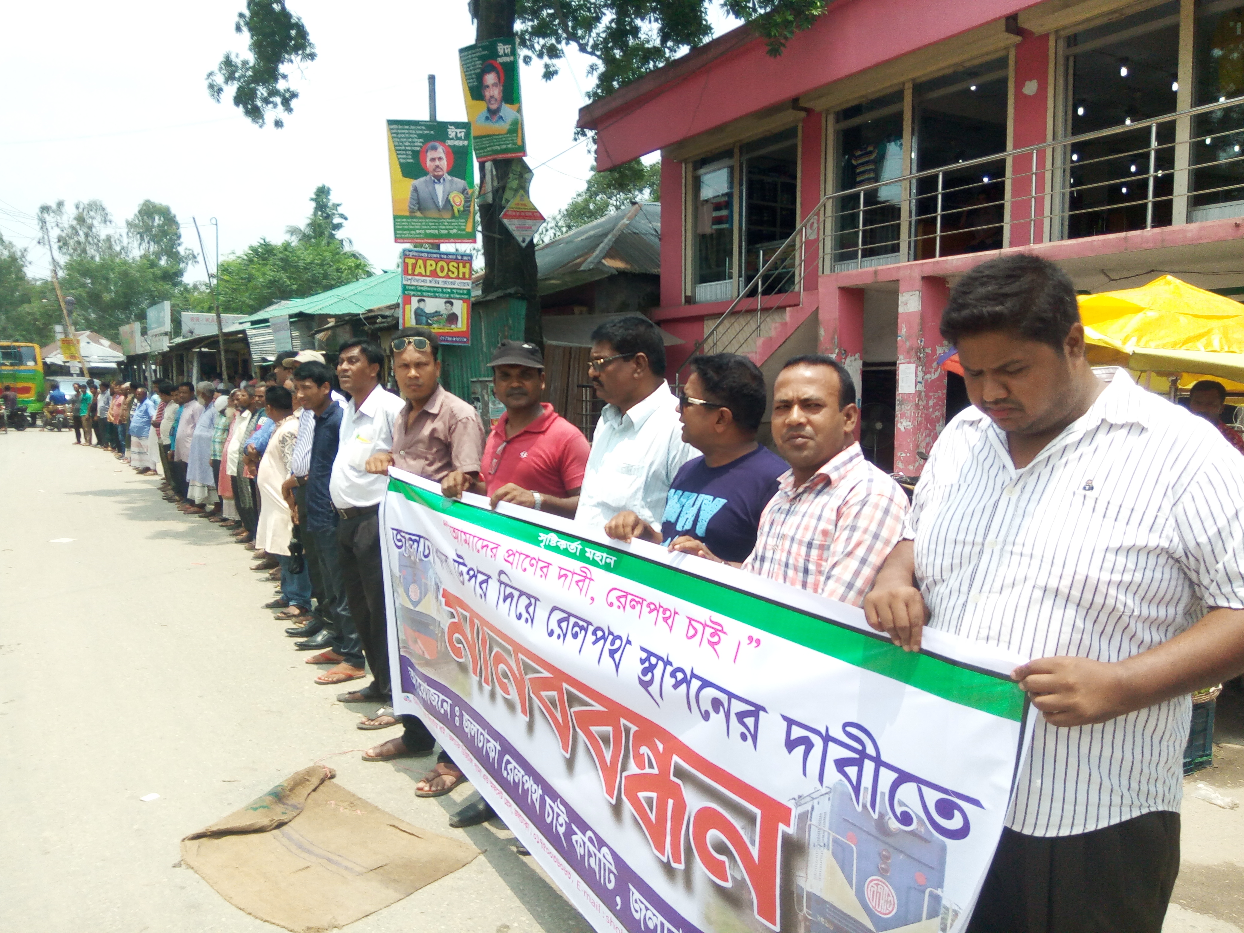 মহিনুল ইসলাম সুজন,নীলফামারী প্রতিনিধি॥ “আমাদের প্রানের দাবী জলঢাকায় রেলপথ চাই” এই শ্লোগানকে সঙ্গে নিয়ে নীলফামারীর জলঢাকায় সোমবার দুপুরে মানববন্ধন করা হয়েছে। এই উপলক্ষে জলঢাকা রেলপথ চাই কমিটির আয়োজনে জিরোপয়েন্ট মোড়ে ঘন্টাব্যাপী মানববন্ধনে বক্তব্য রাখেন জলঢাকা রেলপথ চাই কমিটির আহবায়ক বীর মুক্তিযোদ্ধা আব্দুল গফফার, অনাথ আশ্রম চাঁদমনির প্রতিষ্ঠাতা পরিচালক পিজিরুল আলম দুলাল, সাবেক মেয়র ইলিয়াস হোসেন বাবলু, শ্রমিকলীগ সভাপতি জসির উদ্দিন, আঃলীগ নেতা একে আজাদ, উপজেলা জাসদের সাধারন সম্পাদক হাসিবুল ইসলাম মিতু, যুবলীগের আহবায়ক সারোয়ার হোসেন সাদের, বিএনপি নেতা আলমগীর হোসেন, ছাত্রদলের সাবেক সভাপতি জাহাঙ্গীর আলম, জাসদের সাংগঠনিক সম্পাদক মজিবর রহমান ও রেলপথ চাই কমিটির সদস্য সচিব অবিনাশ রায় প্রমুখ। এসময় উপস্হিত ছিলেন উপজেলা মুক্তিযোদ্ধা সন্তান কমান্ড কাউন্সিলের সভাপতি আসাদুজ্জামান স্টালিন, সামাজিক সংগঠন শিকড় জলঢাকার সাধারন সম্পাদক হাফিজুর রহমান, হিন্দু বৌদ্ধ খ্রীষ্টান ঐক্য পরিষদের সহ সভাপতি লিটন কর্মকার, মৎস্যজীবী লীগের সভাপতি আব্দুর রহমান, উপজেলা সেচ্ছাসেবকলীগের সাধারন সম্পাদক মশিউর রহমান বাবু, যুবলীগ নেতা লাভলুর রশীদ, সাবেক ছাত্রলীগ সাধারন সম্পাদক আখতারুজ্জামান বাবু, হিন্দু মহাজোটের সভাপতি গৌতম রায়, স্পন্দন শিল্পী গোষ্ঠীর সভাপতি রেজাউল হক, সমাজকর্মী শতফুল সংগঠনের পরিচালক আব্দুল মালেক ও শিমুল চন্দ্র রায়। অনুষ্ঠানটি পরিচালনা করেন সাংবাদিক মর্তুজা ইসলাম মাষ্টার। মানববন্ধনে বক্তারা অচিরেই জলঢাকার উপর দিয়ে রেলপথ দ্রুত বাস্তবায়নের দাবী জানান। এর আগে রবিবার রাতে মুক্তিযোদ্ধা আব্দুল গফফার কে আহবায়ক ও প্রভাষক অবিনাশ রায় কে সদস্য সচিব করে ৫১ সদস্য বিশিষ্ট জলঢাকা রেলপথ চাই কমিটি গঠন করা হয়।