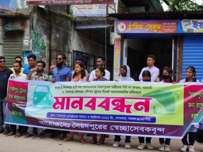 নওশাদ আনসারীর সভাপতিত্বে ও ইমরান হোসেন সুলতানের সঞ্চালনায় মানবন্ধনের বক্তব্য দেন, সাংবাদিক এম আর আলম ঝন্টু, সেতুবন্ধনের সভাপতি আলমগীর হোসেন, অগ্রযাত্রার তারিকুল ইসলাম, সোশ্যাল এক্টিভিটিস্ট তামিম রাহমান, স্বপ্নদিশারীর খন্দকার আবিদা সুলতানা, মিলন মোস্তাফিজ, ড্রিমস বাংলাদেশের রিফাত, আলোর মিছিলের শাহজাহান, হ্যালো সৈয়দপুরের আব্দুল খালেক, স্বেচ্ছাসেবী তাবাসসুম আক্তার প্রমুখ।