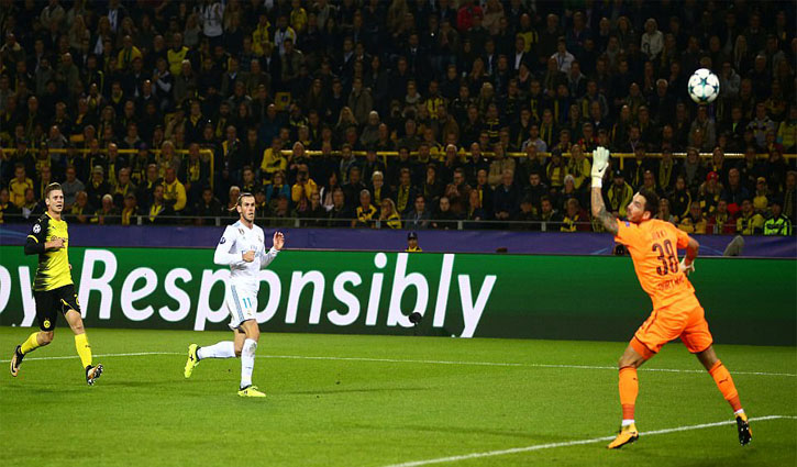 ডর্টমুন্ডের মাঠে আগের ছয় ম্যাচে জয়শূন্য ছিল রিয়াল মাদ্রিদ। তিনটি ম্যাচ ড্র হয়েছিল, বাকি তিনটিতে রিয়াল হেরেছিল। সিগনাল ইদুনা পার্কে জয়খরা কাটানোর পথে রিয়াল এগিয়ে যায় ম্যাচের ১৮ মিনিটে বেলের দুর্দান্ত এক গোলে। দানি কারবাহালের ক্রস থেকে ২৮ বছর বয়সি ওয়েলস উইঙ্গারের চমৎকার ভলি খুঁজে নেয় স্বাগতিকদের জাল।