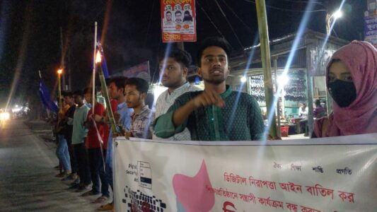 এ সময় জেলা ছাত্র ইউনিয়নের সভাপতি অনিরুদ্ধ প্রণয় প্রান্তিক বলেন, ‘আমরা যারা ছাত্র ইউনিয়ন করি তারা বুকের তাজা রক্ত বিলিয়ে দিতে বিন্দু পরিমাণ দ্বিধাবোধ করতে শিখিনি। যে ডিজিটাল নিরাপত্তা আইন আমাদের বাক-স্বাধীনতার চর্চাকে রুদ্ধ করেছে সেই আইন অবিলম্বে বাতিল করতে হবে এবং অন্যদিকে ক্যাম্পাসে ছাত্র রাজনীতির নামে যারা সন্ত্রাসী কার্যক্রম চালাচ্ছে তাদের উৎখাত করতে হবে ।’