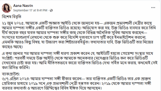 ‘২১ জুন ২০২৫, আমাকে একটি অজ্ঞাত আইডি থেকে জানানো হয়— একজন প্রভাবশালী নেত্রীর কাছে আমার দাম্পত্য সঙ্গীর একটি ব্যক্তিগত ভিডিও রয়েছে। অভিযোগ করা হয়, উক্ত ভিডিও ব্যবহার করে তিনি দীর্ঘ কয়েক বছর যাবত আমার দাম্পত্য সঙ্গীর কাছ থেকে বিভিন্ন অনৈতিক সুবিধা আদায় করছেন— সংসদের হ্যান্ডলার্স লেখানো থেকে শুরু করে বিদেশি দূতাবাসে চাপ সৃষ্টি করে ইনভাইটেশন করানো, এমনকি আরও কিছু বিষয়, যা উচ্চারণ করা শিষ্টাচারবহির্ভূত। তথ্যদাতার দাবি, উক্ত ভিডিওটি তার নিজের কাছেও আছে।