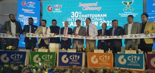 দি ফেডারেশন অফ বাংলাদেশ চেম্বার অফ কর্মাস অ্যান্ড ইন্ডাস্ট্রি (এফবিসিসিআই )সভাপতি জনাব মোঃ জসিম উদ্দিন, মেলা কমিটির উপদেষ্টা ও চিটাগাং চেম্বার সভাপতি জনাব মাহাবুবুর আলম,৩০তম আন্তর্জাতিক বানিজ্য মেলা (CITF) ২০২৩ এর উদ্বোধনী অনুষ্ঠানে মেলা কমিটির চেয়ারম্যান জনাব এ,কে,এম,আক্তার হোসেন তার বক্তব্যে জানান,১৯৯৩ সাল থেকে আমরা দেশীয় পন্যের প্রসার ও প্রচারের লক্ষ্যে চট্টগ্রাম আন্তর্জাতিক বানিজ্য মেলা আয়োজন করে আসছি।এ ধারাবাহিকতায় এবার ৩০তম আন্তর্জাতিক বানিজ্য মেলা (CITF) ২০২৩ চট্টগ্রাম রেলওয়ে পলোগ্রাউন্ড মাঠে আজ শুভ উদ্বোধন হতে যাচ্ছে।