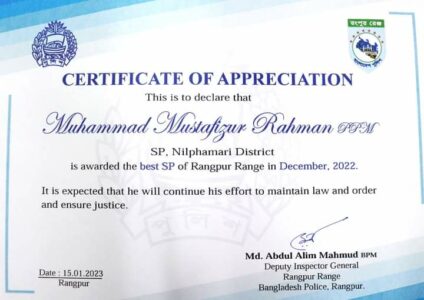 উল্লেখ্য যে,গত অক্টোবর/২০২২ এবং নভেম্বর/২০২২ মাসের কর্ম মূল্যায়নেও রংপুর রেঞ্জের শ্রেষ্ঠ জেলা হয়েছিলো নীলফামারী ও শ্রেষ্ঠ পুলিশ সুপার হয়েছিলো নীলফামারী পুলিশ সুপার মোহাম্মদ মোস্তাফিজুর রহমান পিপিএম ।