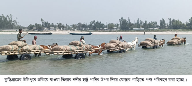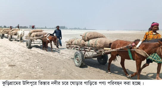 কুড়িগ্রাম প্রতিনিধিঃ কুড়িগ্রামের উলিপুরে তিস্তার চরাঞ্চলে শুকনো মৌসুমে মানুষের একমাত্র ভরসা ঘোড়ার গাড়ি। চর গুলোতে মানুষের চলাচলসহ নিত্যপন্য ও কৃষিপন্য পরিবহনে অন্য কোন মাধ্যম না থাকায় ঘোড়ার গাড়ি হচ্ছে বিকল্প ব্যবস্থা। প্রত্যন্ত চরাঞ্চলে রাস্তাঘাট না থাকায় নদীর হাটুপানি ও বালু চরে পণ্য পরিবহন, অসুস্থ রোগীকে বহন এবং যাতায়াতের একমাত্র মাধ্যম হিসেবে ব্যবহার করা হয় ঘোড়ার গাড়িকে।