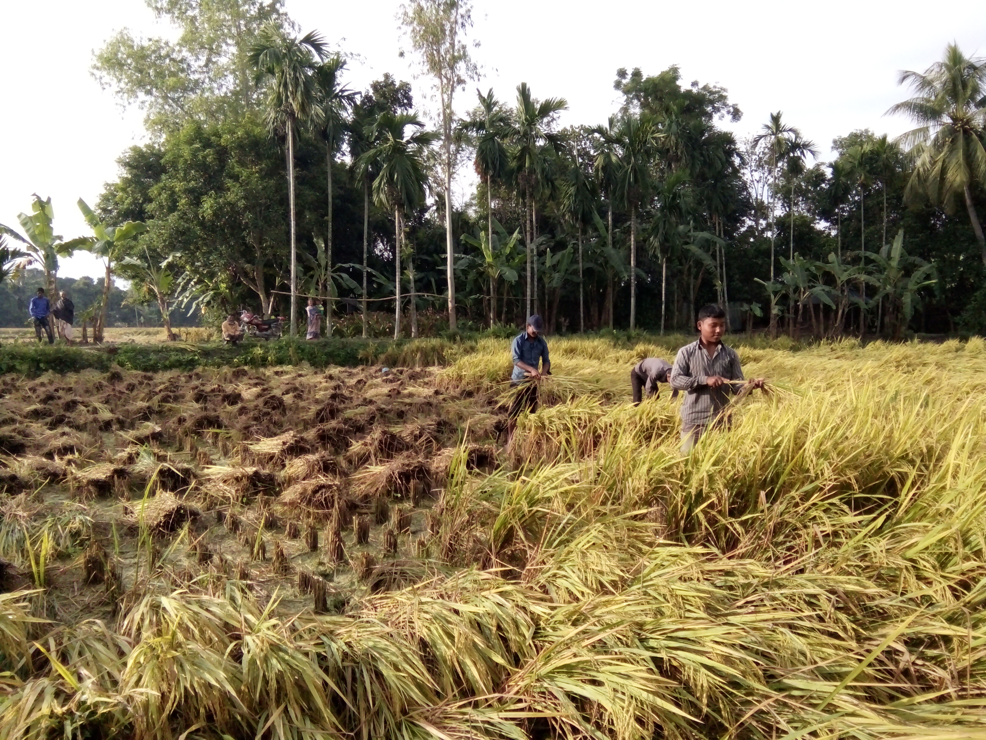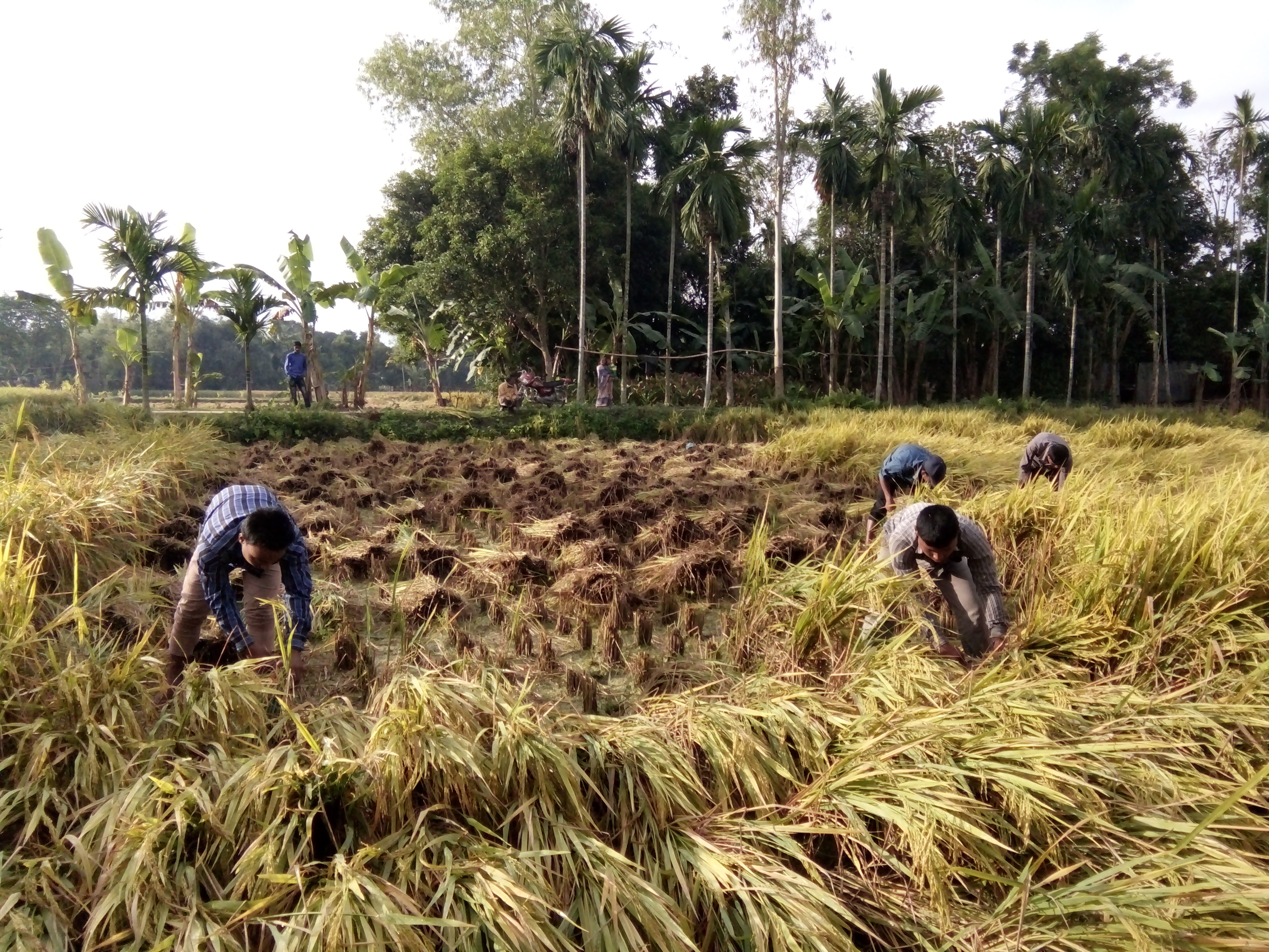 হেমন্তের ধান কাটার উৎসবে উপজেলার হাসিমপুর গ্রামে এরকম বিরল দৃশ্য চোখে পড়ল । তিন যুবক ধান কাটতে ব্যস্ত এবং একজন খাড়া ধানে বাঁশ দিচ্ছে। স্থানীয় বিকাশ রায়ের সাথে কথা বলে জানা যায়, দিনমজুর জগৎ রায়ের এক মেয়ে ও দুই ছেলের মধ্যে কৃষ্ণ রায় দ্বিতীয়, অরবিন্দু রায় বাবলুর ছোট ছেলে লিটন চন্দ্র এ বছর দক্ষিণ গাড়পাড়া উচ্চ বিদ্যালয় থেকে এসএসসি পরীক্ষার ফরম পূরণ করেছে এবং রাজবিহারি অধিকারীর দুই ছেলের মধ্যে বড় ছেলে তুষার অধিকারী পাকেরহাট ডিগ্রি কলেজে প্রথম বর্ষের ছাত্র। আর অন্যজন অনিল চন্দ্র রায়ের ছোট ছেলে শুভ রায় প ম শ্রেণী পর্যন্ত পড়ালেখা করার পর অভাব অনটনের সংসারে একরকম বাধ্য হয়ে কাজে লেগে পড়ে। তাদের সাথে কথা বলার চেষ্টা করলে তারা লজ্জায় এড়িয়ে যায়। মুখ নিচু করে ধান কাটতে ব্যস্ত হয়ে পড়ে। তবে একটু অপেক্ষার পরে কৃষ্ণ রায়ের মা দিপালি রানী এবং তুষার অধিকারীর মা ননী বালা’র সাথে কথা হয়। পড়ালেখার সময় ছেলেদের অন্যের বাড়ীতে কাজ করার কারন জিজ্ঞাসা করলে তারা জানায়, অভাব অনটনের সংসারে নিজেদের পড়ালেখা ও পোষাক-পরিচ্ছদের খরচ যোগাতে তাদের ছেলেরা স্কুলের ফাঁকে ফাঁকে অন্যের বাড়ীতে কাজ করে। মাঝে মাঝে সংসারে টাকা দেয়। আরো জানা যায়, জগৎ রায়ের নিজের ভিটের মাটি টুকুও নেই। পার্শ¦বর্তী বিভূতি ভূষনের জমিতে বাড়ী করে আছে।
