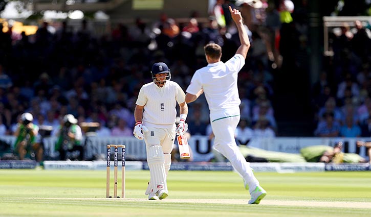 ৫ উইকেটে ৩৫৭ রান নিয়ে লর্ডসে শুক্রবার দ্বিতীয় দিনের খেলা শুরু করে ইংল্যান্ড। রুট ১৮৪ ও মঈন আলী ৬১ রানে ব্যাটিং শুরু করেন। ইংলিশ অধিনায়ক জো রুটের সামনে ছিল ইতিহাস গড়ার হাতছানি। তৃতীয় ব্যাটসম্যান হিসেবে অধিনায়কত্বের অভিষেকে ডাবল সেঞ্চুরির রেকর্ড হাতছানি দিচ্ছিল তার। কিন্তু নার্ভাস নাইন্টিসের শিকার রুট। ১৯০ রানে মরকেলের বলে আউট হন উইকেটের পিছনে ডি ককের হাতে ক্যাচ দিয়ে। ২৩৪ বলে ১৯০ রানের ইনিংসটি সাজান ২৭ চার ও ১ ছক্কায়। একই ওভারের তৃতীয় বলে লিয়াম ডসনকেও ফেরান মরকেল। মঈন আলীও বেশিক্ষণ টিকতে পারেননি। ৮৭ রানে আউট হন কাগিসো রাবাদার বলে। এরপর স্টুয়ার্ট ব্রডের হাফ-সেঞ্চুরিতে ৪৫৮ রানের সংগ্রহ পায় ইংল্যান্ড। পেসার মর্নি মরকেল নেন সর্বোচ্চ ৪ উইকেট। ৩টি করে উইকেট নেন ফিল্যান্ডার ও রাবাদা।
