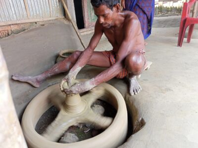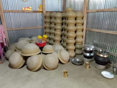 আল-আমিন, নীলফামারী: বাব দাদার হাতে খুঁটি, হাঁড়ী, পাতিল, সারোয়া, কলস, শ্লিম, পেচি, ব্যাংক, প্লেট, রুটি বানা তাওয়া, চারি, কান্টা, ফুলের টপ, থালা, মাটির খেলনা বানা (তৈরী) শিখছো। এখন স্মামীর সংসারে ২১ বছর থাকি এই কাম (কাজ) করি। স্বামী, বেটি দুইটা ছেলে একটা ওলাও এই কামই করে। তাও সংসার চলে না। কথা গুলো বলেন, নীলফামারী সদরের সোনারায় ইউনিয়নের উত্তর মুসরত কুকাপাড়া গ্রামের কুমার পাড়ার নমিতা পাল (৩৯)।