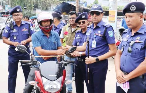 জেলা পুলিশ সুপার সড়কে চলমান মোটরসাইকেল আরোহীরা যারা হেলমেট পরে ছিলেন তাদের ফুল দিয়ে শুভেচ্ছা জানান এবং হেলমেট বিহীন মোটরসাইকেল আরোহীদের হেলমেট পড়িয়ে সচেতন হওয়ার আহ্বান জানান। সেই সাথে তিনি সচেতনতামূলক লিফলেট বিভিন্ন গাড়িতে লাগিয়ে দেন।