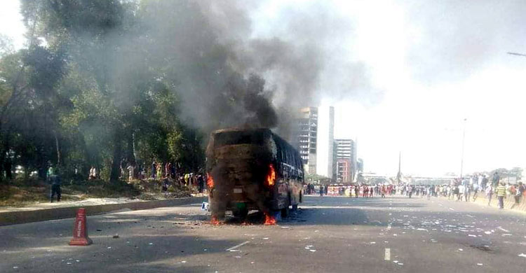 শ্রমিকদের এই অবরোধের মধ্যেই দুপুর সোয়া ১টার দিকে বিমানবন্দর গোলচত্বরে এনা পরিবহনের একটি বাসে আগুন দেয়া হয়েছে।