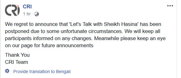 তবে অনুষ্ঠানটি অদূর ভবিষ্যতে নিকটবর্তী সময়ে নতুন তারিখে হবে বলেও সিআরআই এর পক্ষ থেকে জানানো হয়। ১৬ নভেম্বর বিকেল ৪টায় অনুষ্ঠানটি বিটিভিসহ বিভিন্ন টেলিভিশন চ্যানেলে একযোগে সম্প্রচার করার কথা ছিল।