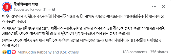 এর আগে এক পোস্টে ইনকিলাব মঞ্চের পক্ষ থেকে জানানো হয়, বাংলাদেশ বিমানের একটি বাণিজ্যিক ফ্লাইটে শুক্রবার সিঙ্গাপুরের স্থানীয় সময় বিকাল ৩টা ৫০ মিনিটে শহীদ ওসমান হাদির লাশ নিয়ে ঢাকার উদ্দেশ্যে রওনা করা হবে। ফ্লাইটটি সন্ধ্যা ৬টা ৫ মিনিটে ঢাকার হযরত শাহজালাল আন্তর্জাতিক বিমানবন্দরে অবতরণ করার কথা রয়েছে।