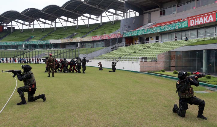 কিন্তু বাংলাদেশে পা রাখার আগেই মিরপুর স্টেডিয়ামে নিরাপত্তা নিয়ে শঙ্কা! বৃহস্পতিবার বেলা ১২টায় হঠ্যাৎ স্টেডিয়ামে গোলাগুলি। স্টেডিয়ামে ‘অ্যাটাক’ করেছে দুধর্ষ সন্ত্রাসী। চোখের পলকের মধ্যেই উদ্ধারে এসেছে সেনাবাহিনীর ‘এক’ প্যারা কমান্ডো ব্যাটেলিয়ান।