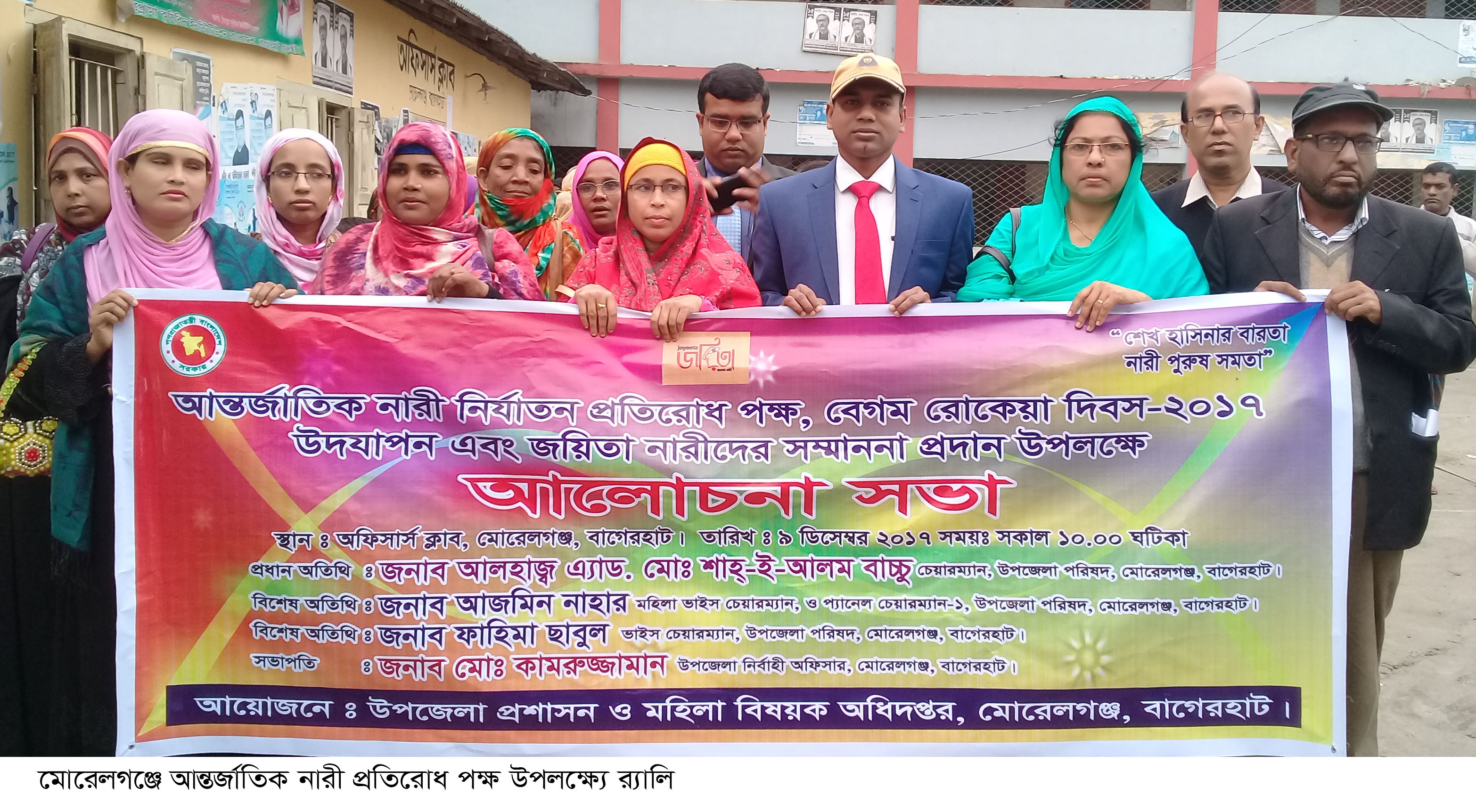 মো:রফিকুল ইসলাম,মোরেলগঞ্জ ॥ “শেখ হাসিনার বারতা,নারী পুরুষ সমতা” প্রতিপাদ্য বিষয় নিয়ে বাগেরহাটের মোরেলগঞ্জে শনিবার পালিত হয়েছে আন্তর্জাাতিক নারী নির্যাতন প্রতিরোধ পক্ষ ২০১৭। দেয়া হয়েছে জয়িতা নারীদের সম্মাননা। এ উপলক্ষে মোরেলগঞ্জে বেগম রোকেয়া দিবস পালন ও চার জয়িতা নারীকে সম্মাননা ক্রেষ্ট প্রদান করা হয়।