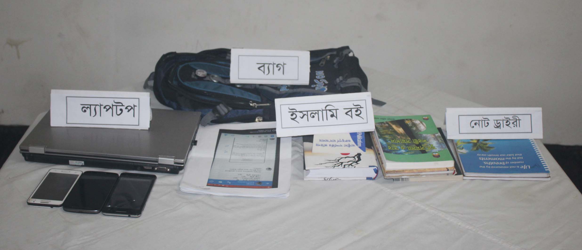 র্যাবের হাতে ধৃত ছাত্র শিবিরের সদস্য হলেন- মোঃ আক্তারুজ্জমান টনি (২২), পিতা- মোঃ আলাউদ্দিন, সাং- পূর্ব ভান্ডারা, থানা- রানীশংকৈল, জেলা- ঠাকুরগাঁও, বর্তমান- সৈয়দ নজরুল হল, রুম নং-৩০৫, বাংলাদেশ টেক্সটাইল বিশ্ববিদ্যালয়, থানা- তেজগাঁও শিল্পা ল,ঢাকা, তারসহযেগী মোঃ আসাদুল্লাহ আল গালিব (২২), পিতা- মোঃ কুদরত-ই-খুদা, সাং- গুনারী গ্রাম, থানা- নাটর সদর, জেলা- নাটর সদর, বর্তমান- জি.এম.এ.জি ওসমানী হল, রুম নং-১০০৩, বাংলাদেশ টেক্সটাইল বিশ্ববিদ্যালয়, থানা- তেজগাঁও শিল্পা ল, ও মোঃ মুনইন সরকার (২৩), পিতা- মোঃ ইসাহাক সরকার, সাং-ফকিরাপাড়া, থানা-জেলা- দিনাজপুর সদর, বর্তমান- সৈয়দ নজরুল হল, রুম নং-১০৪, বাংলাদেশ টেক্সটাইল বিশ্ববিদ্যালয়, থানা- তেজগাঁও শিল্পা ল, ডিএমপি, ঢাকা। এদের কাছ থেকে ১টি ল্যাপটপ, তিনটি মোবাইল সিম,১টি র্যাগ, ১টি ভিডিও ক্লিপ, ১০টি প্রিন্ট আউট কাগজ,২টি নোট ডাইরী ও একটি শিবিরে যোগদান পত্র উদ্বার করে র্যাব। এ বিষয়ে প্রয়োজনীয় আইনানুগ ব্যবস্থা প্রক্রিয়াধীন আছে বলে জানিয়েছে র্যাব-২।