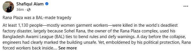 রানা প্লাজা ধসের ঘটনাকে ‘আওয়ামী লীগের তৈরি ট্র্যাজেডি’ বলে বর্ণনা করেছেন প্রধান উপদেষ্টার প্রেস সচিব শফিকুল আলম। তিনি বলেন, ‘বিশ্বের ইতিহাসে সবচেয়ে ভয়াবহ শিল্প-দুর্ঘটনায় অন্তত ১,১৩০ জন নিহত হন। যাদের বেশিরভাগই নারী পোশাকশ্রমিক।এ ঘটনার মূল কারণ ছিল ভবনটির মালিক সোহেল রানা এবং তার আওয়ামী লীগের রাজনৈতিক প্রভাব ব্যবহার করে নিয়ম ভাঙা ও সতর্কবার্তা উপেক্ষা করা।’