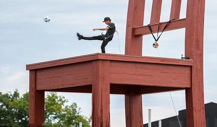 এছাড়া উঁচু এ চেয়ারের মূর্তির ওপর উঠে ফুটবল ডিসপ্লে দেখান তিনি। ওই সময় বেসবলের কালো ক্যাপ এবং ‘রিপেয়ার লিভস’ লেখা হ্যান্ডিক্যাপের টি-শার্ট পরিধান করেন ব্রাজিলিয়ান এ তারকা।