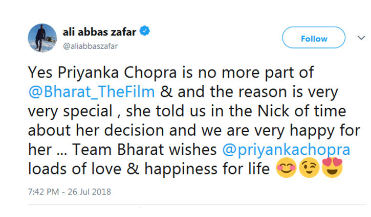 আলী আব্বাস জাফর লিখেছেন, ‘হ্যাঁ, প্রিয়াঙ্কা আর ভারত সিনেমার অংশ নন এবং এর পেছনে রয়েছে বিশেষ কারণ। তিনি আমাদের তার সিদ্ধান্ত সম্পর্কে শেষ মুহূর্তে ( নিক অব টাইম) জানিয়েছেন এবং আমরা এতে ভীষণ খুশি। ভারত সিনেমার টিমের পক্ষ থেকে প্রিয়াঙ্কার জন্য অসংখ্য ভালোবাসা ও শুভকামনা। ২০১৭ সালে মেট গালার লাল গালিচায় একসঙ্গে হাজির হয়েছিলেন প্রিয়াঙ্কা ও মার্কিন সংগীতশিল্পী নিক জোনাস। কিছুদিন আগে তাদের একসঙ্গে নৈশভোজে দেখা যায়। এরপর থেকেই তাদের প্রেমের গুঞ্জন চাউর হয়। এছাড়া কয়েকদিন আগে ভারতে আসেন নিক। গুঞ্জন শোনা যায়, প্রিয়াঙ্কার মায়ের সঙ্গে দেখা করার জন্যই নিকের এই সফর। শুধু তাই নয়, এবারের জন্মদিনটা কথিত প্রেমিকের সঙ্গেই পালন করেছেন প্রিয়াঙ্কা। এদিকে প্রিয়াঙ্কা সরে দাঁড়ানোর পর তার পরিবর্তে সিনেমাটিতে কে অভিনয় করবেন তা নিয়ে তৈরি হয়েছে জল্পনা-কল্পনা। ধারণা করা হচ্ছে, ক্যাটরিনা কাইফকে দেখা যেতে পারে সিনেমাটিতে। সালমান খান ছাড়াও ভারত সিনেমাটি আরো অভিনয় করছেন দিশা পাটানি, সুনীল গ্রোভার, টাবু, জ্যাকি শ্রফ প্রমুখ।