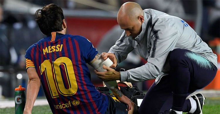 অবস্থা খারাপ দেখে মাঠে ঢুকে পড়েন বার্সেলোনার ফিজিও। মেসিকে সাইড লাইনের বাইরে নিয়ে যান। মনে হচ্ছিল, হয়তো প্রাথমিক চিকিৎসার পর মাাঠে নামতে পারবেন। পরে দেখা গেল, মেসির ডান হাতে ব্যান্ডেজ পেঁচিয়ে দিয়েছেন ফিজিও। তার বদলে মাঠে নামানো হয়েছে ডেম্বেলেকে।