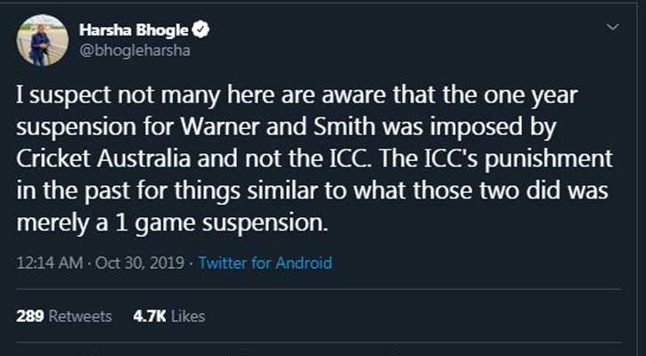 মঙ্গলবার (২৯ অক্টোবর) এক টুইটে তিনি ভক্তদের উদ্দেশে বলেন, আমার সন্দেহ, অনেকেই অবগত নয় যে, ওয়ার্নার ও স্মিথের ওপর নিষেধাজ্ঞা দিয়েছিল ক্রিকেট অস্ট্রেলিয়া, আইসিসি নয়। তারা যে অপরাধ করেছে অতীতে এ ধরনের কর্মকাণ্ডের জন্য সাজা ছিল বড়জোর এক ম্যাচ বহিষ্কার।